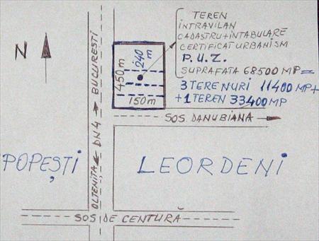 --OFERTA DE EXCEPTIE INVESTITIE--SE VINDE SI SEPARAT--3 TERENURI DE 11400 mp DESC=80 M ALIPIT DE 1 TEREN 34300 MP DESCH 240 M TOTAL 68500 MP LA DN 4 BUCURESTI-OLTENITA POPESTI LEORDENI INTRAVILAN CAD+ INTAB+ PUZ+URBANISM COLT CU SOS SPRE DANUBIANA TOATE UTILITATILE PRETUL S-A REDUS LA 90 E/MP (TVA INCLUS) NEGOCIABIL 10-20 E/MP NECULA TEL 0723205867 0753013991